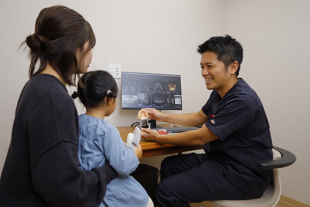 また、私の妻は保育士であり保育の視点を生かし、こどもたちが0歳から楽しく通えるような環境づくりや、成長段階で気になる口のクセ(指しゃぶりや舌の位置など)を早期に改善する取り組みも行ってまいります。お子さまからご年配の方まで、家族みんなが笑顔で通える歯科医院でありたいと願っています。